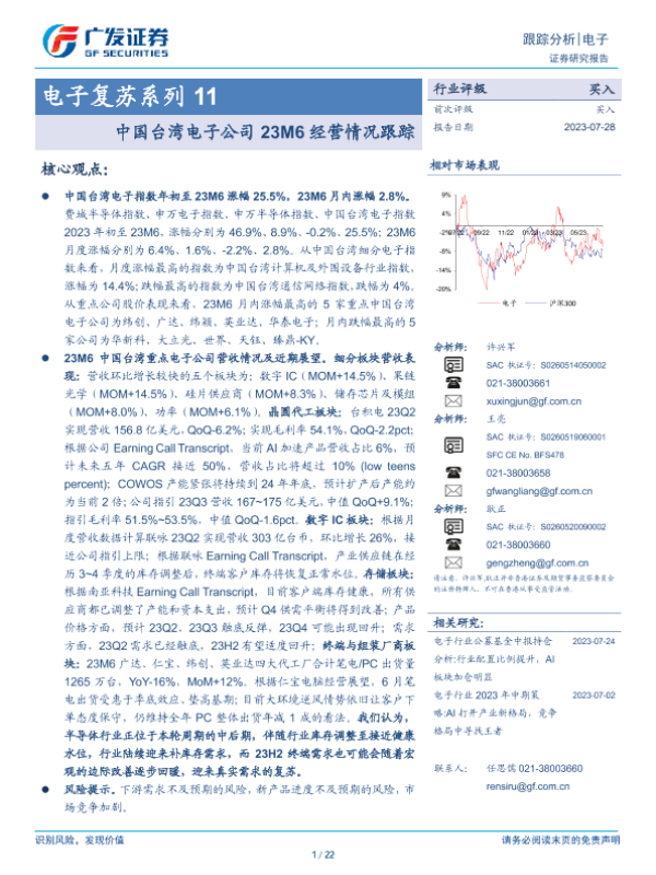 【广发证券】【20230728】电子复苏系列11:中国台湾电子公司23M6经营情况跟踪-22页 行业研究