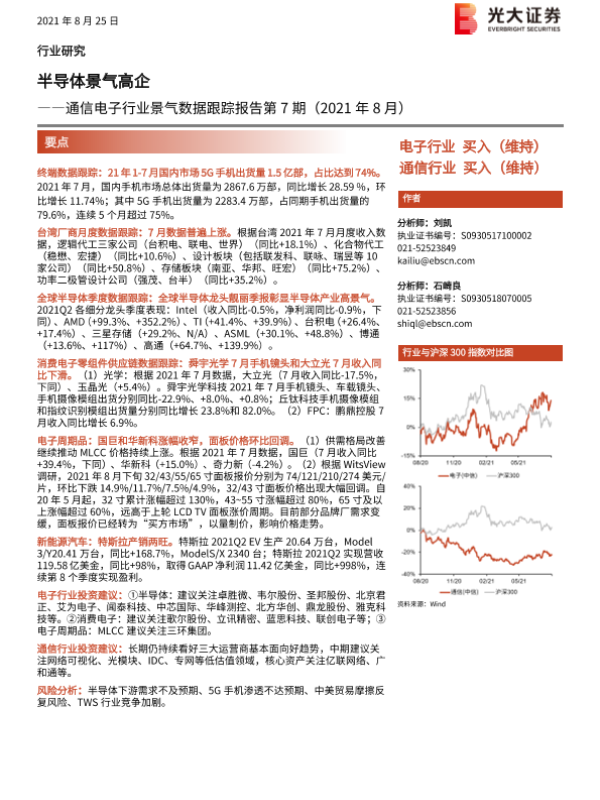 【光大证券】【20210825】通信电子行业景气数据跟踪报告第7期(2021年8月):半导体景气高企-58页 行业研究