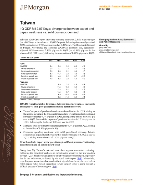 【J.P. Morgan】【20230526】Taiwan's 1Q GDP fell 2.87%; divergence between export and capex weakness vs. solid domestic demand-9页 行业研究