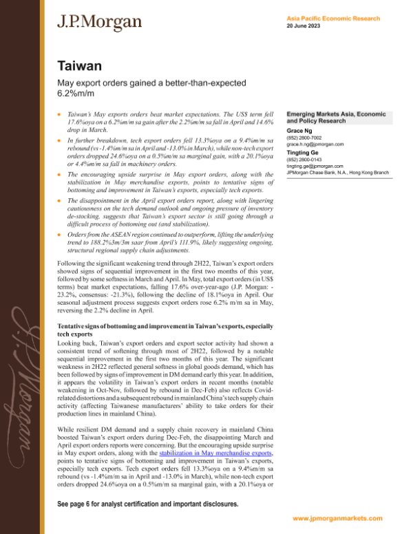 【J.P. Morgan】【20230620】organ Econ FI-Taiwan May export orders gained a better-than-expected 6.2%-10页 行业研究