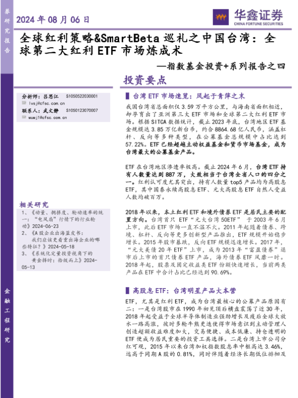 【华鑫证券】【20240806】指数基金投资+系列报告之四:全球红利策略&SmartBeta巡礼之中国台湾,全球第二大红利ETF市场炼成-18页 行业研究