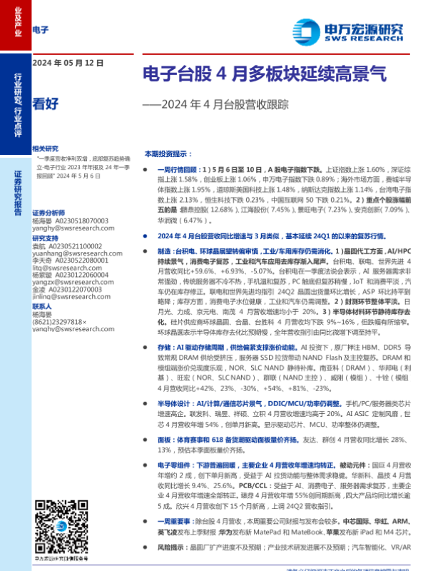 【申万宏源】【20240512】电子行业2024年4月台股营收跟踪:电子台股4月多板块延续高景气-15页 行业研究