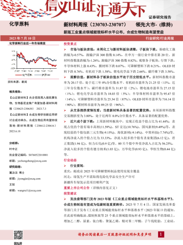 【山西证券】【20230710】新材料周报:新版工业重点领域能效标杆水平公布,合成生物制造有望受益-26页 行业研究