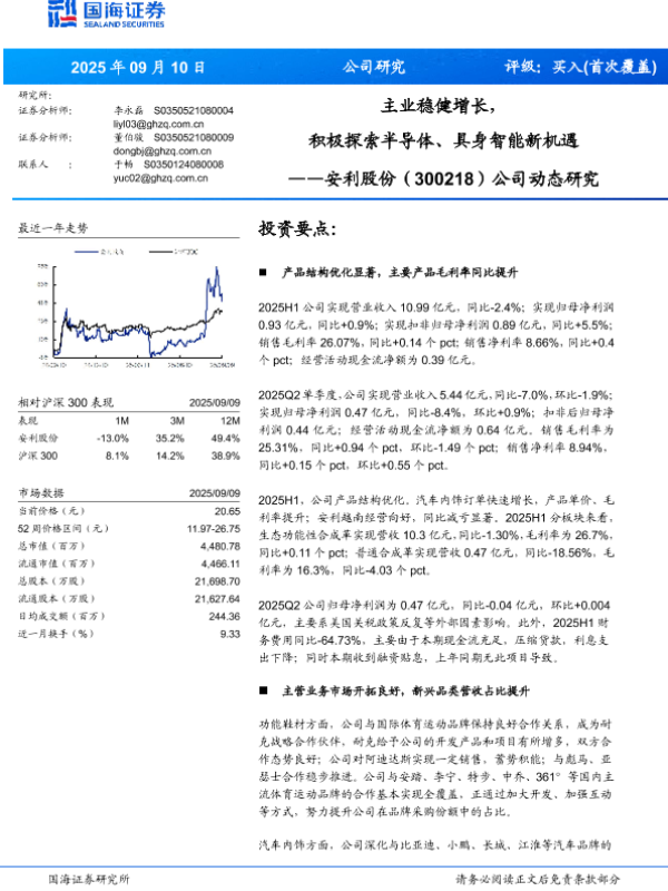 【国海证券】【202509】主业稳健增长,积极探索半导体、具身智能新机遇——安利股份(300218)公司动态研究-10页 公司研究