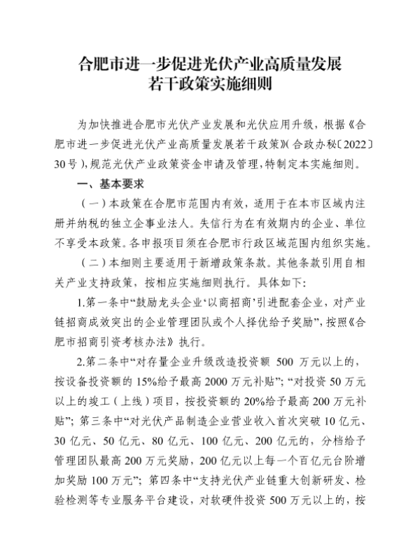 【合肥市经信局、合肥市财政局】【2022】合肥市经信局、合肥市财政局关于开展2022年度合肥市进一步促进光伏产业高质量发展若干政策支持分布式应用项目补充申报的通知-10页 政策文件