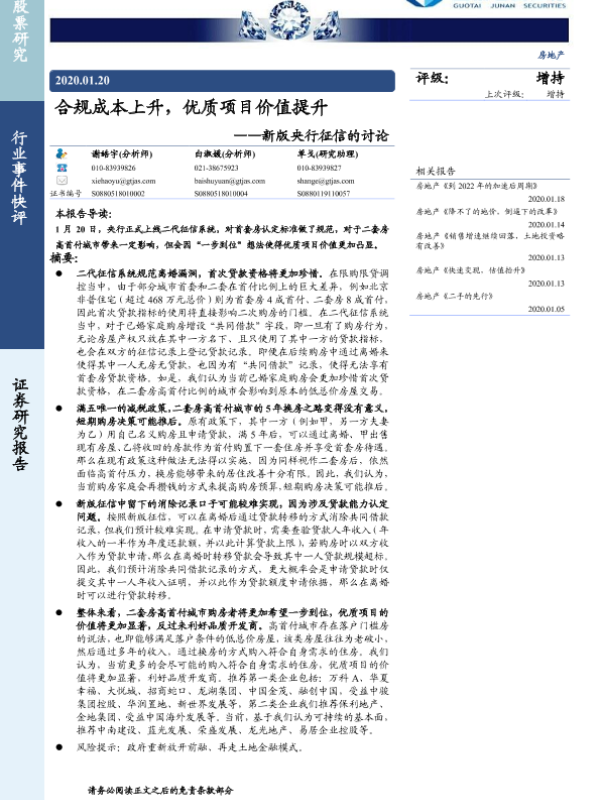 【国泰君安证券】【20200120】新版央行征信的讨论:合规成本上升,优质项目价值提升-3页 行业研究