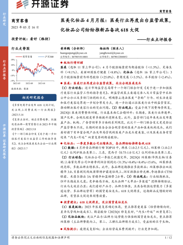 【开源证券】【20230516】医美化妆品4月月报:医美行业再度出台监管政策,化妆品公司纷纷推新品备战618大促-12页 行业研究
