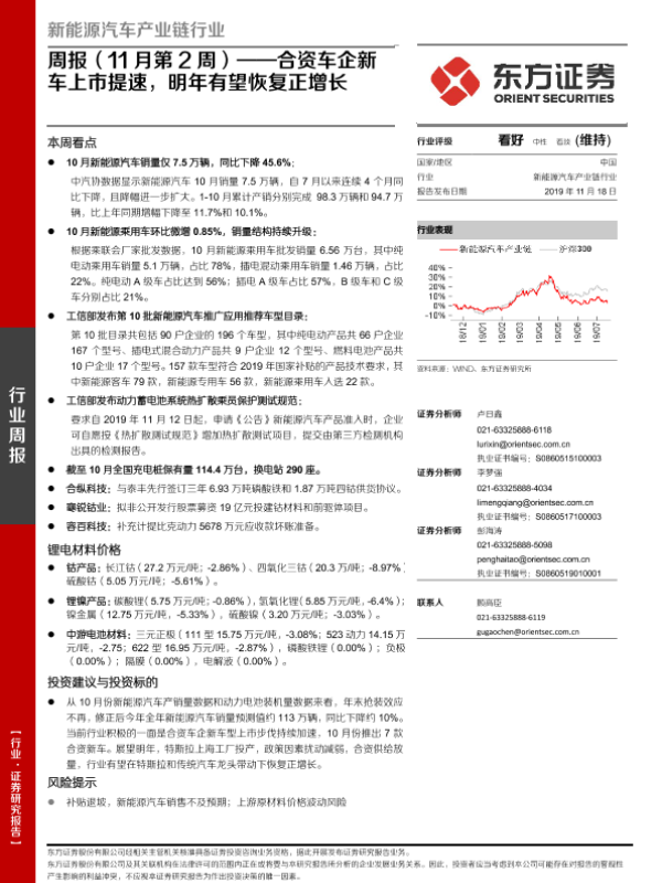 【东方证券】【20191118】20191118-东方证券-新能源汽车产业链行业周报(11月第2周):合资车企新车上市提速,明年有望恢复正增长-26页 行业研究