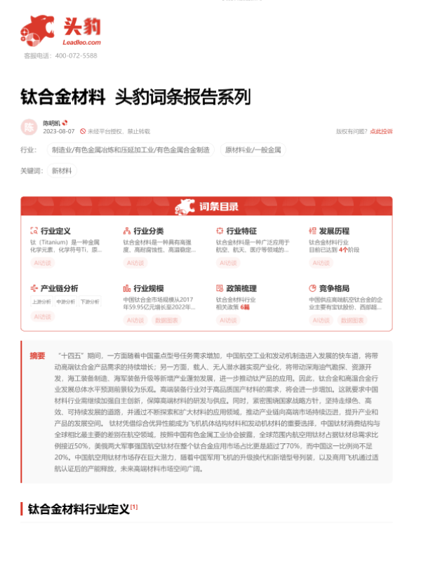 【头豹研究院】【202308】钛合金材料 头豹词条报告系列-16页 行业研究