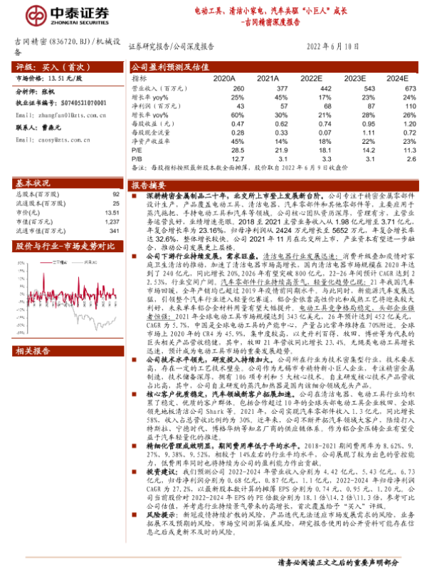 【中泰证券】【20220610】20220610-中泰证券-吉冈精密深度报告:电动工具、清洁小家电、汽车共驱“小巨人”成长-28页 行业研究