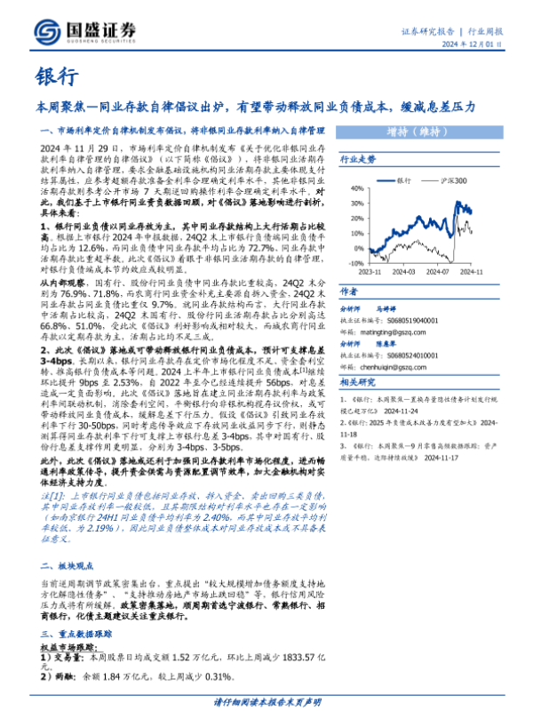 【国盛证券】【20241201】本周聚焦—同业存款自律倡议出炉,有望带动释放同业负债成本,缓减息差压力-12页 行业研究