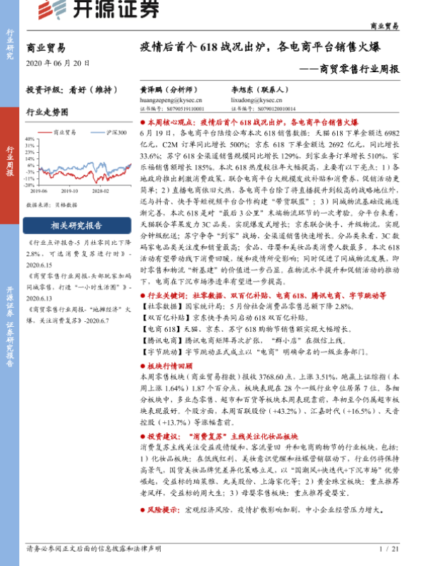【开源证券】【20200620】商贸零售行业周报:疫情后首个618战况出炉,各电商平台销售火爆-21页 行业研究