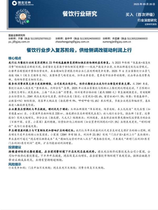 【国金证券】【202509】餐饮行业步入复苏阶段,供给侧调改驱动利润上行-13页 证券期货研究报告