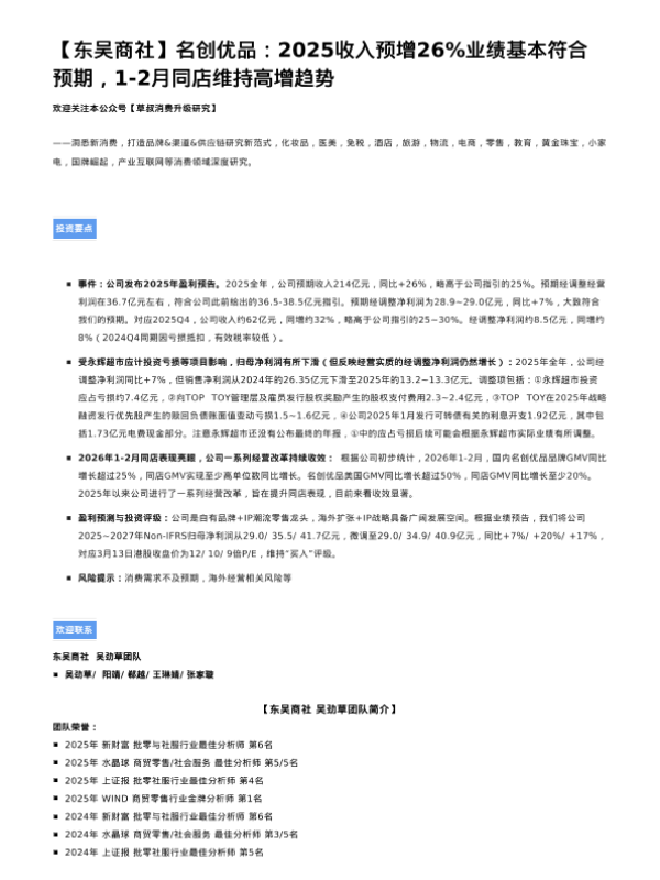 【东吴证券】【202603】名创优品(09896.HK)2025盈利预告点评:收入同比+26%业绩基本符合预期,1-2月同店维持高增趋势-3页 证券期货研究报告