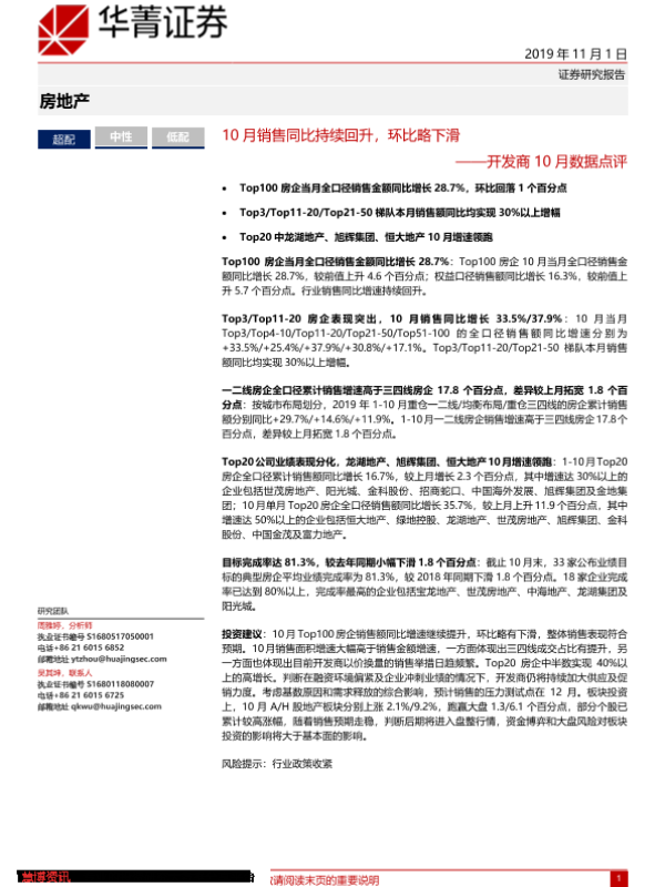 【华兴证券】【20191101】开发商10月数据点评:10月销售同比持续回升,环比略下滑-12页 行业研究