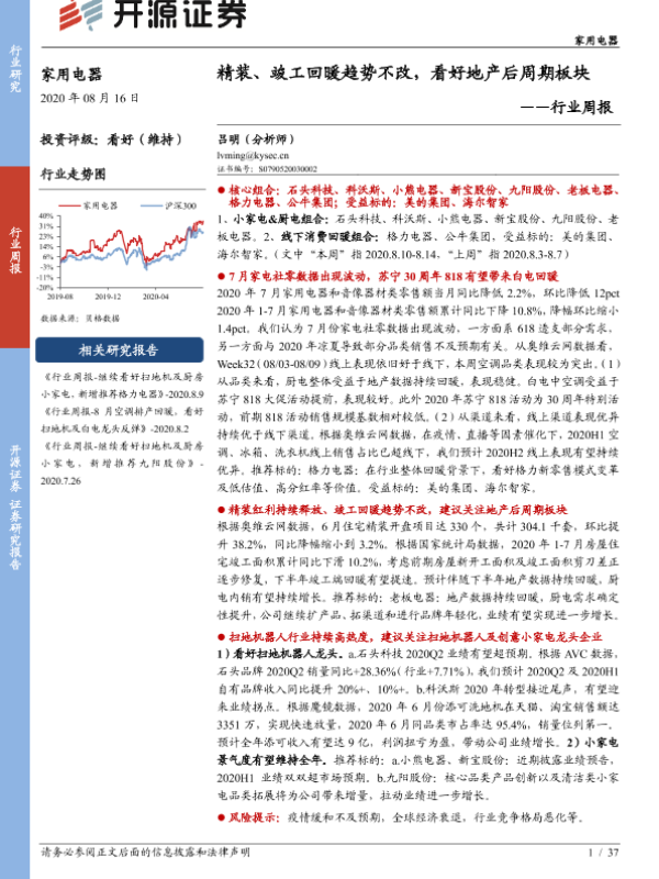 【开源证券】【20200816】20200816-开源证券-家用电器行业周报:精装、竣工回暖趋势不改,看好地产后周期板块-37页 行业研究
