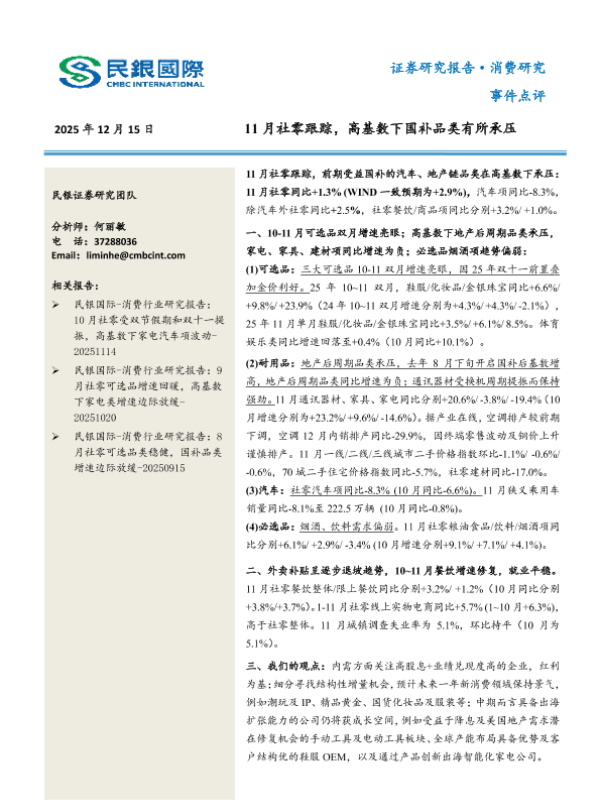 【民银证券】【202512】11月社零跟踪,高基数下国补品类有所承压-9页 证券期货研究报告