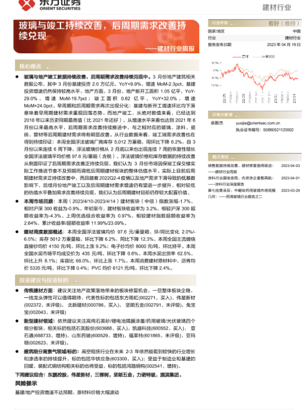 【东方证券】【20230419】建材行业周报:玻璃与竣工持续改善,后周期需求改善持续兑现-20页 行业研究