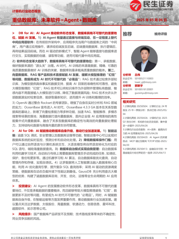 【民生证券】【20250506】计算机行业动态报告:重估数据库,未来软件=Agent+数据库-13页 证券期货研究报告