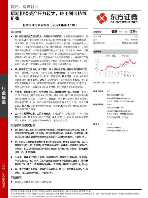 【东方证券】【20210426】20210426-东方证券-有色钢铁行业周策略(2021年第17周):后期粗钢减产压力较大,吨毛利或持续扩张-27页 行业研究