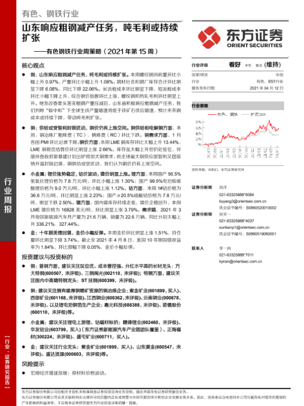 【东方证券】【20210412】20210412-东方证券-有色钢铁行业周策略(2021年第15周):山东响应粗钢减产任务,吨毛利或持续扩张-26页 行业研究