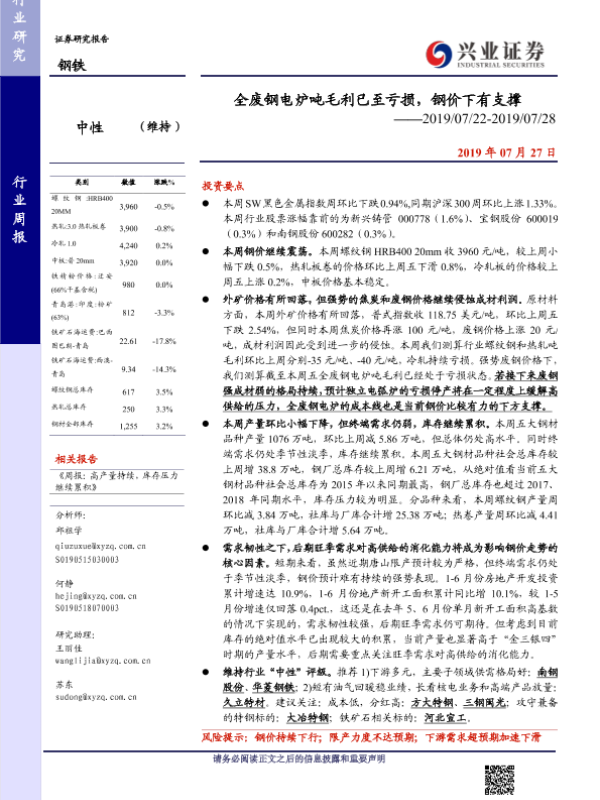 【兴业证券】【20190727】全废钢电炉吨毛利已至亏损,钢价下有支撑-17页 行业研究