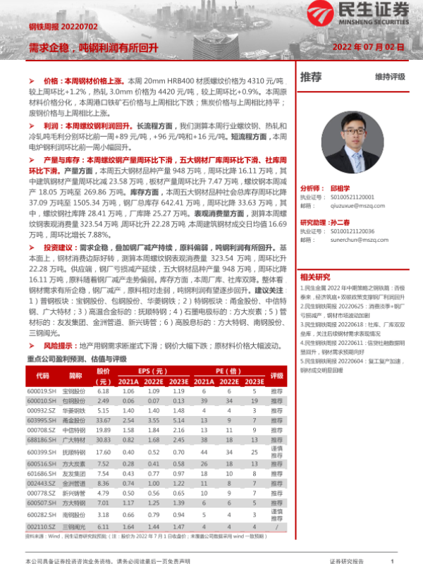 【民生证券】【20220702】20220702-民生证券-钢铁周报:需求企稳,吨钢利润有所回升-20页 行业研究