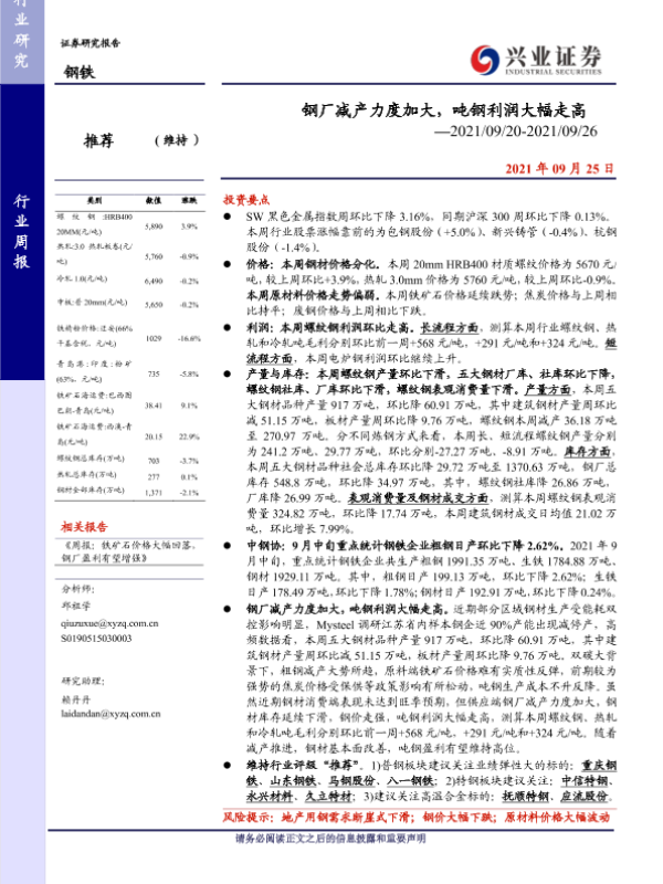【兴业证券】【20210925】钢厂减产力度加大,吨钢利润大幅走高-17页 行业研究