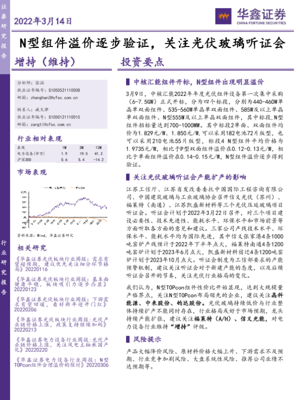 【华鑫证券】【20220314】电力设备行业:N型组件溢价逐步验证,关注光伏玻璃听证会-17页 行业研究