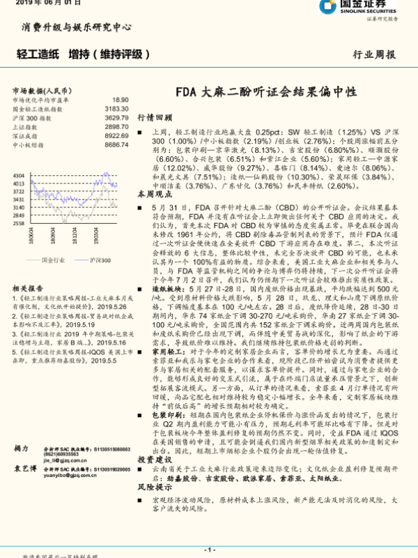 【国金证券】【20190601】20190601-国金证券-轻工造纸行业周报:FDA大麻二酚听证会结果偏中性-28页 行业研究