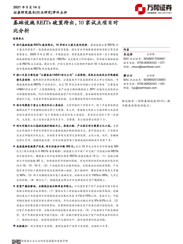 【万和证券】【20210514】公用事业行业:基础设施REITs破茧待出,10家试点项目对比分析-12页 行业研究