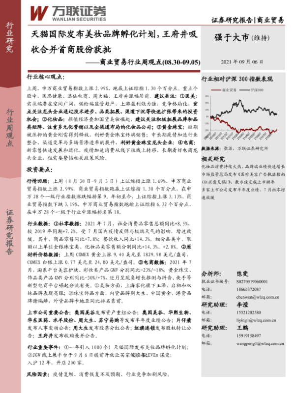 【万联证券】【20210906】商业贸易行业周观点:天猫国际发布美妆品牌孵化计划,王府井吸收合并首商股份获批-11页 行业研究