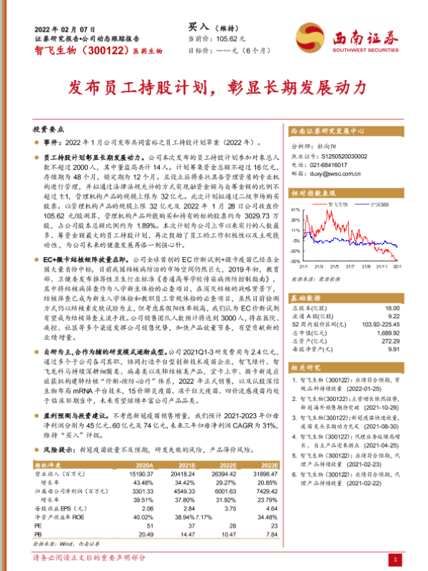 【西南证券】【20220207】20220207-西南证券-智飞生物-300122.SZ-发布员工持股计划_彰显长期发展动力-4页 行业研究