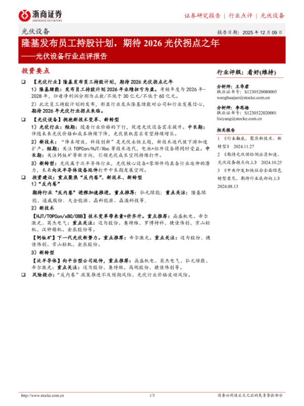 【浙商证券】【202411】隆基发布员工持股计划,期待2026光伏拐点之年-3页 证券期货研究报告