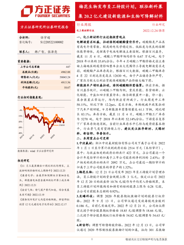 【方正证券】【20221224】化工新材料行业周报:梅花生物发布员工持股计划,联泓新科募集20.2亿元建设新能源和生物可降解材料-41页 行业研究