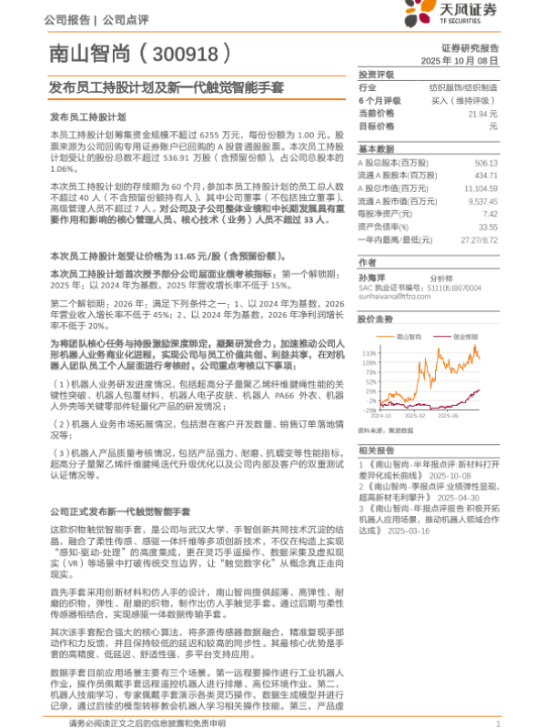 【天风证券】【202510】南山智尚-发布员工持股计划及新一代触觉智能手套-4页 证券期货研究报告