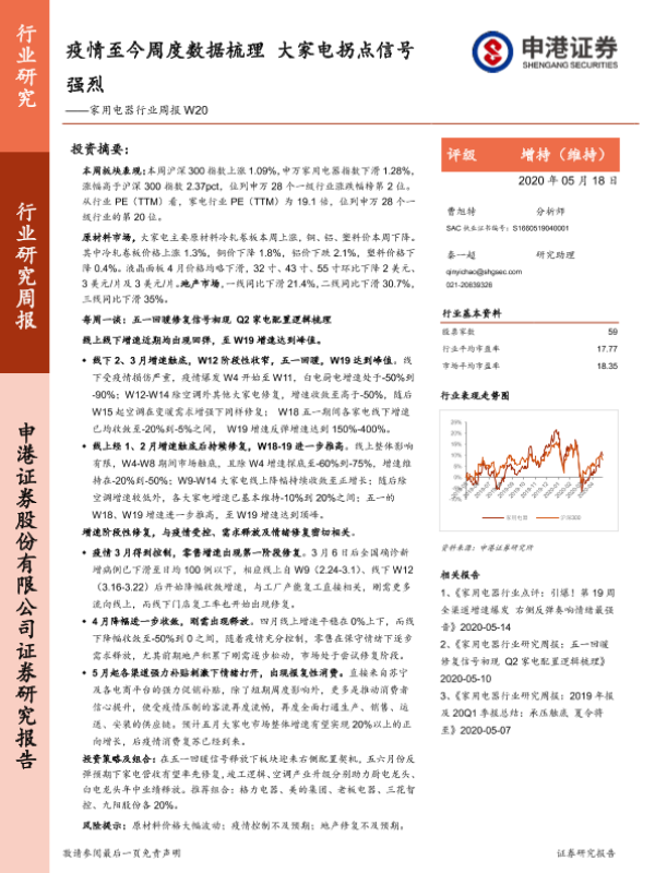 【申港证券】【20200518】20200518-申港证券-家用电器行业周报W20:疫情至今周度数据梳理 大家电拐点信号强烈-16页 行业研究