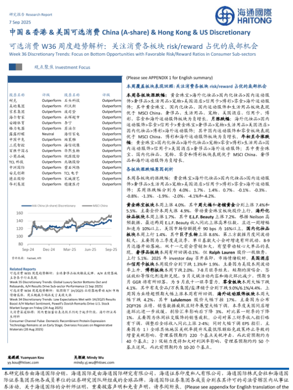 【海通国际】【202509】中国&香港&美国可选消费 China(A-share)& Hong Kong& US Discretionary 可选消费 W36周度趋势解析:关注消费各板块 risk/reward占优的底部机会-15页 证券期货研究报告