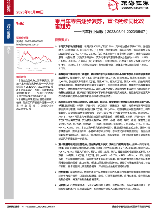【东海证券】【20230508】20230508-东海证券-汽车行业周报:乘用车零售逐步复苏,重卡延续同比改善趋势-13页 行业研究