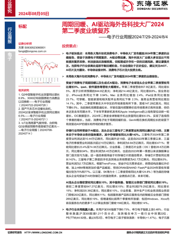 【东海证券】【20240805】周期回暖、AI驱动海外各科技大厂2024第二季度业绩复苏-15页 行业研究