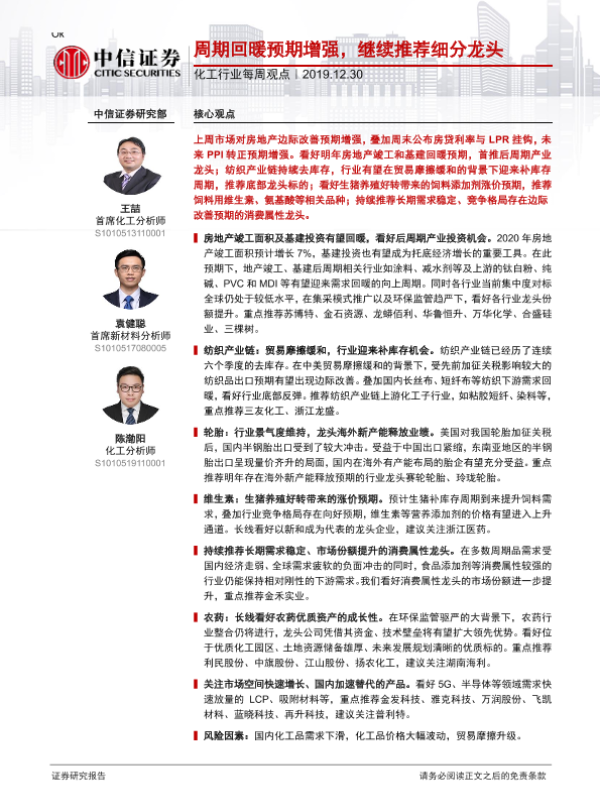 【中信证券】【20191230】20191230-中信证券-化工行业每周观点:周期回暖预期增强,继续推荐细分龙头-27页 行业研究