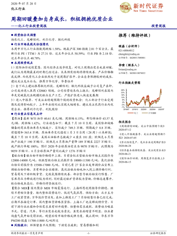 【新时代证券】【20200720】20200720-新时代证券-化工行业投资周报:周期回暖叠加自身成长,积极拥抱优质企业-18页 行业研究