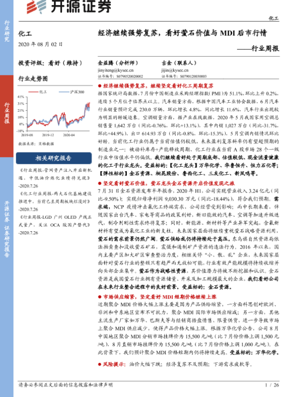 【开源证券】【20200802】20200802-开源证券-化工行业周报:经济继续强势复苏,看好萤石价值与MDI后市行情-26页 行业研究