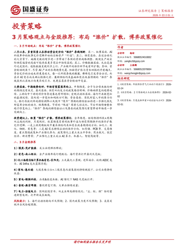 【国盛证券】【202603】3月策略观点与金股推荐:布局“涨价”扩散,博弈政策催化-9页 证券期货研究报告