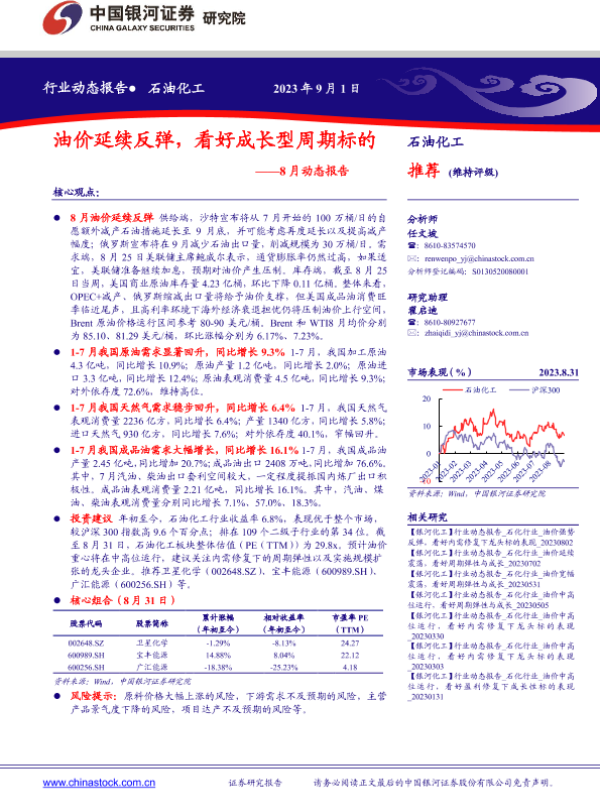 【银河证券】【20230901】20230901-中国银河-石油化工行业8月动态报告:油价延续反弹,看好成长型周期标的-24页 行业研究