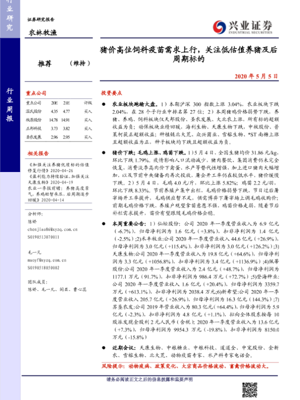【兴业证券】【20200505】20200505-兴业证券-农林牧渔行业周报:猪价高位饲料疫苗需求上行,关注低估值养猪及后周期标的-15页 行业研究