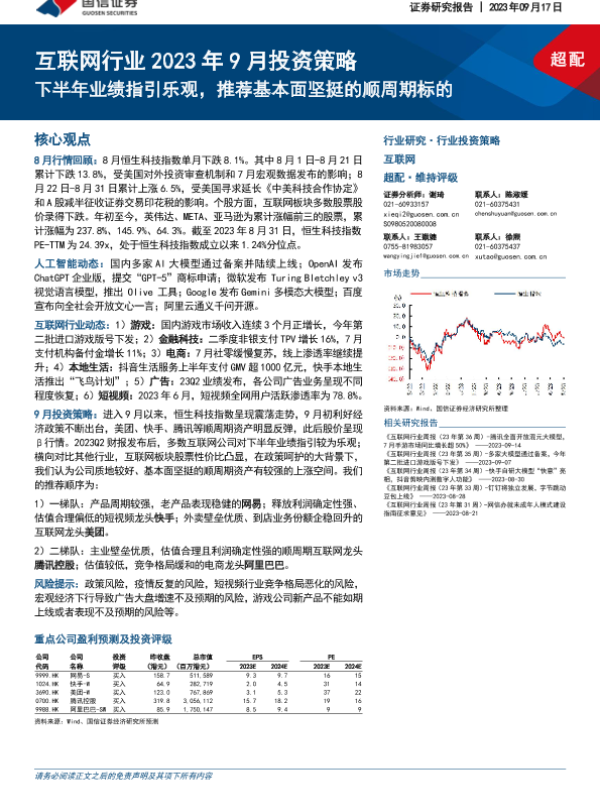 【国信证券】【20230917】互联网行业2023年9月投资策略:下半年业绩指引乐观,推荐基本面坚挺的顺周期标的-27页 行业研究