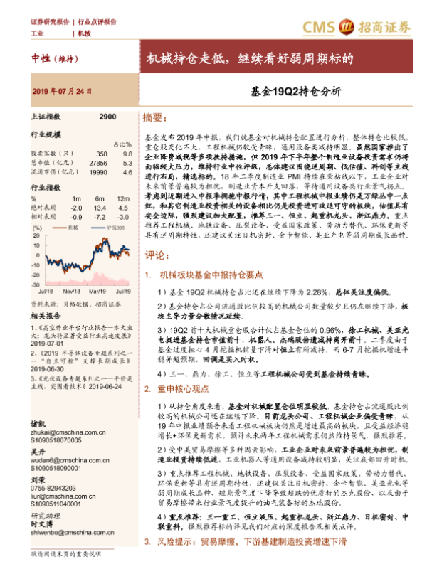 【海通证券】【20190724】基金19Q2持仓分析:机械持仓走低,继续看好弱周期标的-9页 行业研究