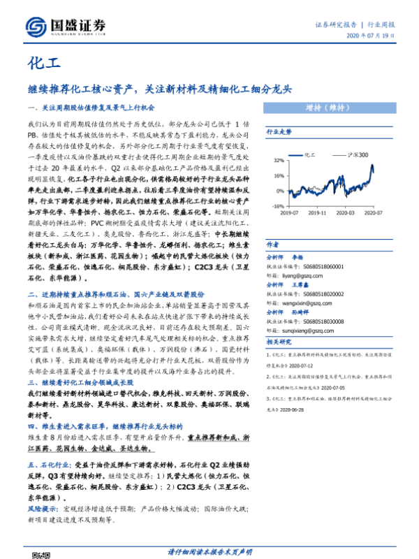 【国盛证券】【20200719】20200719-国盛证券-化工行业周报:继续推荐化工核心资产,关注新材料及精细化工细分龙头-9页 行业研究