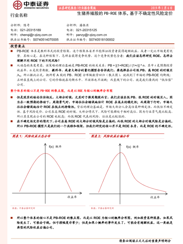 【中泰证券】【20190106】农林牧渔行业报告简版:生猪养殖股的PB-ROE体系,基于不确定性风险定价-10页 行业研究